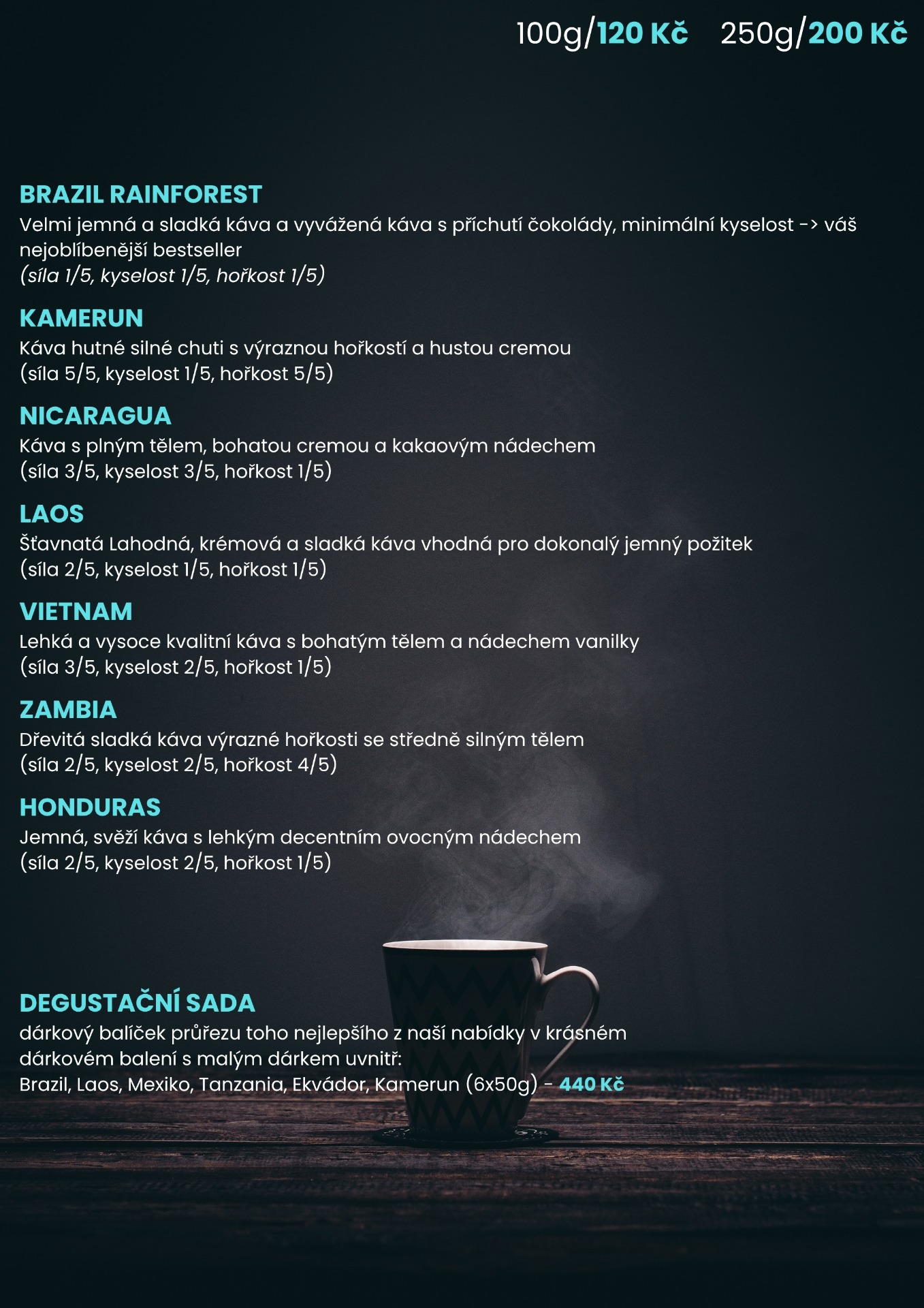 " Čerstvost je pro nás na prvním místě, proto každý měsíc pražíme jen několik druhů káv, abyste vždy dostali tu nejlepší kvalitu. "